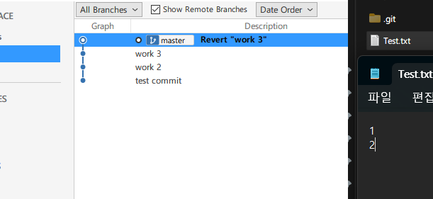 해당 내역을 남기면서도 work 2 의 상태로 되돌리기 위해선 revert , reverse 기능을 사용하면된다.