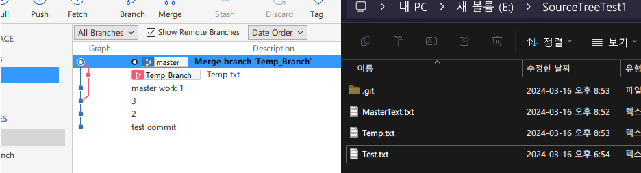 디렉토리에서 보면 Temp 브랜치에 있던 Temp.txt가 합쳐진것을 볼수있다.