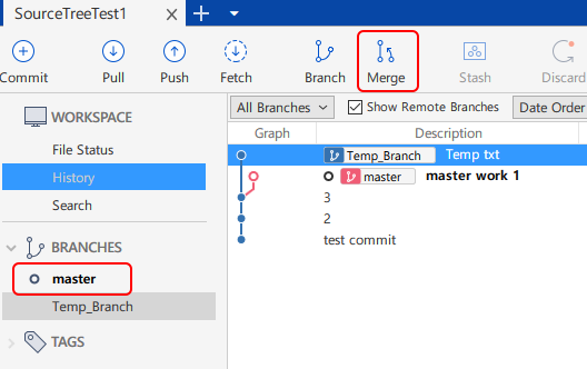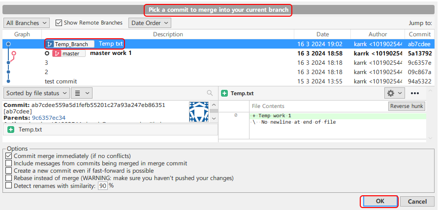 Temp 브랜치를 Master 브랜치로 보낼지 선택해줘야 한다.